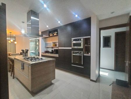 * **Funcionalidad:** Cocina integral con encimeras de granito, torre de hornos y amplios espacios de almacenamiento, patio de lavado, cuarto de servicio, estudio y bodega.