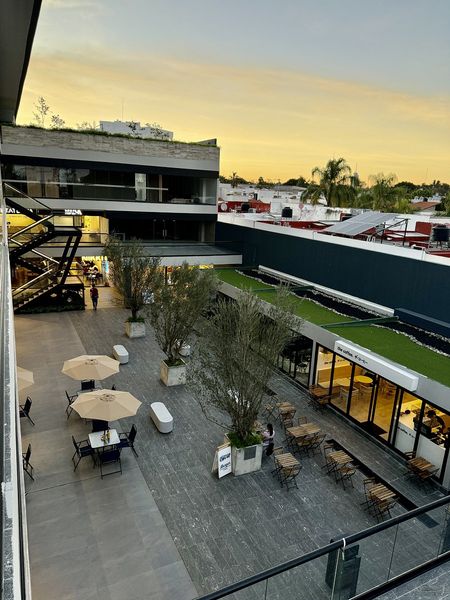 Terraza en nivel 2 con arbolado y mesas, creando un ambiente relajante para comer o trabajar al aire libre.