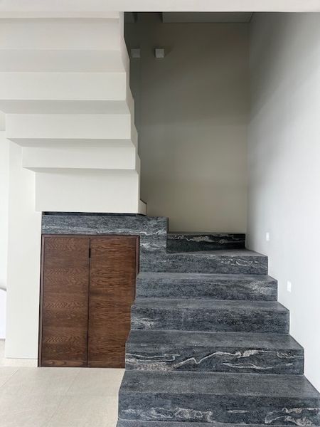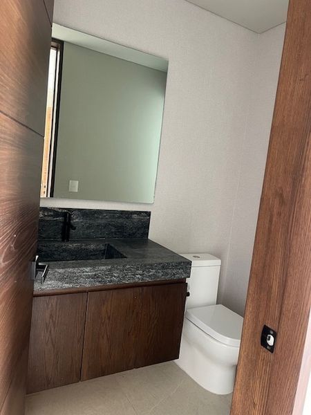 En el primer nivel se encuentra el área de sala-comedor, cocina Integral amplia y equipada, con Splash muro completo, barra desayunador en granito, cuarto de lavado amplio e integrado, patio, estacionamiento para dos coches.