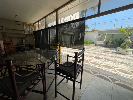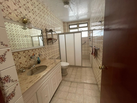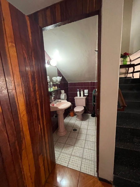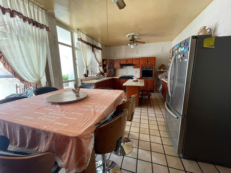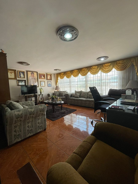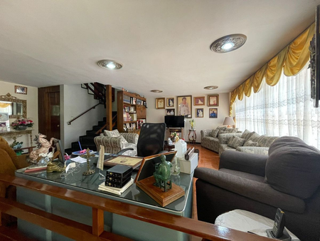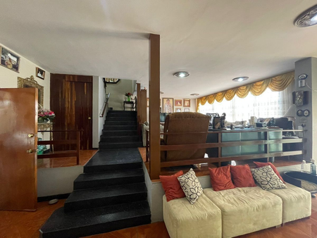 3 pisos, 4 habitaciones, cuarto de servicio, cocina muy amplia, sótano, área con 2 salas, comedor, 3 baños completos y 2 medios, baños en terraza, balcón, área de lavado, bodega, cochera para 4 autos, cancel, buena conservación.